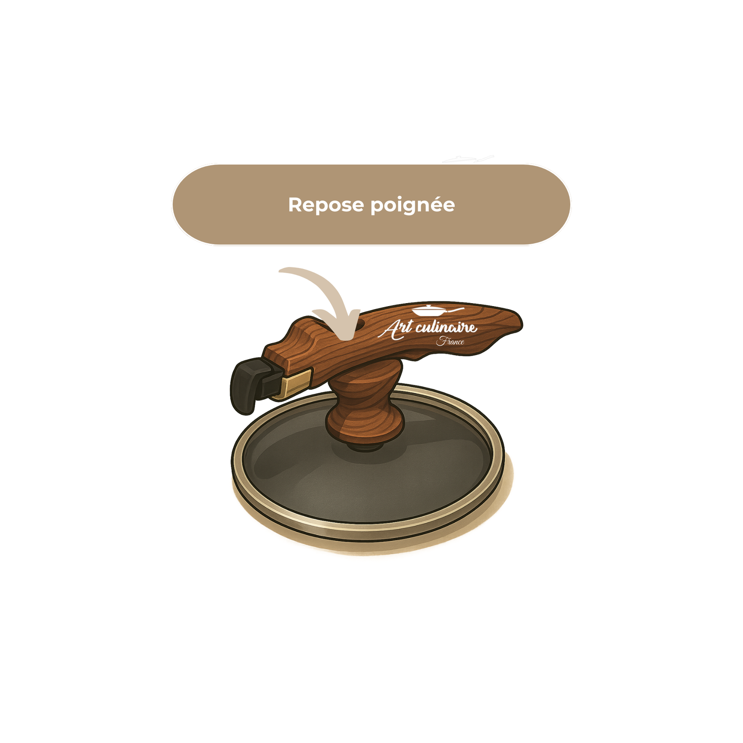 Placer la poignée amovible au dessus du couvercle grâce à l'encoche prévue à cet effet ! Système repensée par Art culinaire !